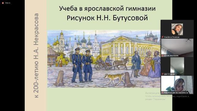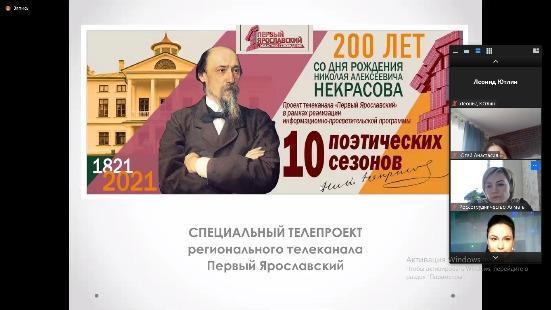 Учащиеся 8А и 8Б класса подготовили литературную композицию, посвященную жизни и творчеству Н. Некрасова. Большой интерес вызвала лекция Марины Михайловой, к.ист.н., заместителя директора Государственного литературно-мемориального музея-заповедника Н.А Некрасова «Карабиха». Она рассказала о писателе как о человеке, который сделал себя сам («self-made man»). Елена Микулина, заместитель директора телеканала Первый Ярославский, поделилась с участниками встречи творческими проектами, которые ведет ярославское телевидение в течение юбилейного некрасовского года.