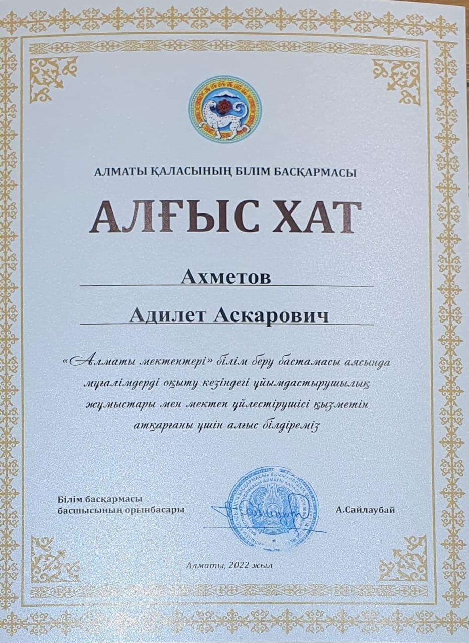 Алматы EDCRUNCH Academy мектептерінің білім беру бастамасы аясында мұғалімдерді оқыту кезінде мектеп үйлестірушісінің жұмысы мен ұйымдастырушылық жұмысы үшін математика мұғалімі Ахметов Әділет Асқарұлы алғыс хатпен марапатталды. Құттықтаймыз! Шығармашылық табыс тілейміз!