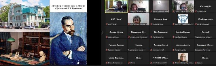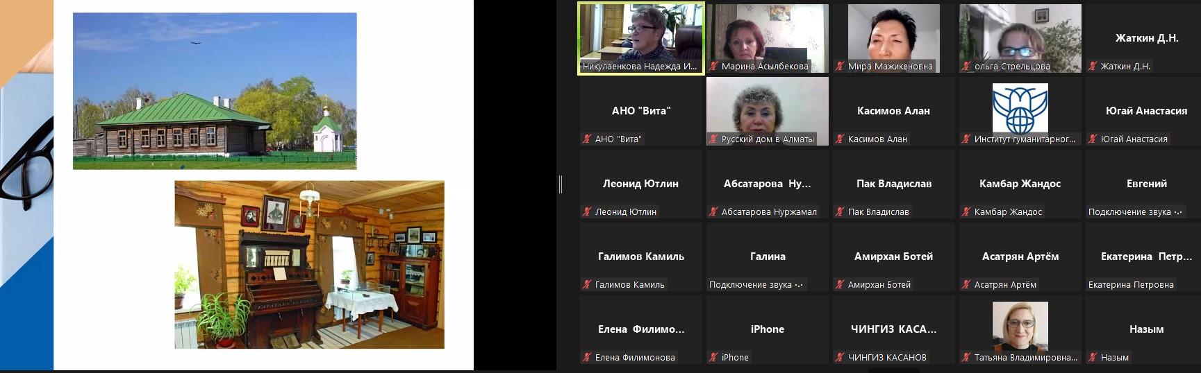 Алматыдағы орыс үйінің қолдауымен Мәскеу "Вита" орталығы өткізетін "оқу шеңбері" білім беру және мәдени-ағарту іс-шараларының шеңберінде 7 қазанда Алматы қаласындағы №165 мамандандырылған лицейдің тоғызыншы сынып оқушыларына "Ресейдің әдеби мұражайларындағы орыс классикасы"виртуалды экскурсиясы өтті. Пенза облысының еңбек сіңірген мәдениет қызметкері Надежда Никулаенкова Царское Селода, Михайловский мен Болдинода Пушкин мұражайларының құрылу тарихы, Тарханадағы М. Ю. Лермонтов мұражай-қорығы, Н. А. Некрасовтың "Карабиха" мұражайы, Л. Н. мұражайы туралы, Толстой Ясная Полянада, Переделкинодағы керемет балалар ертегішісі К.И. Чуковскийдің мұражайы туралы айтты. Жарқын, қызықты экскурсия тағы да лицейшілерге ақындар мен