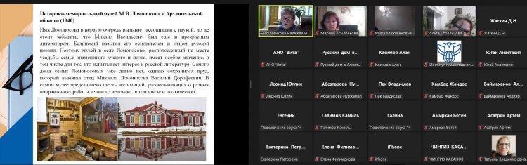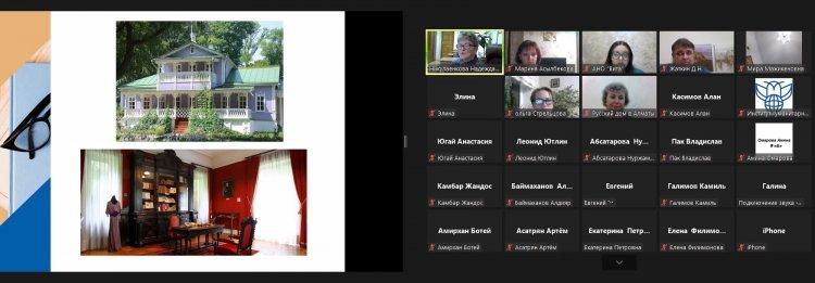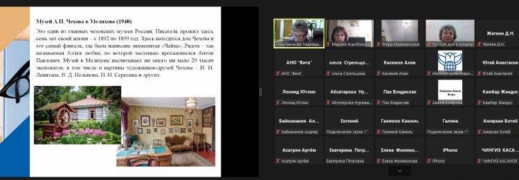 В рамках цикла образовательных и культурно-просветительских мероприятий «Круг чтения online», проводимого московским Центром «Вита» при поддержке Русского дома в Алматы, 7 октября состоялась для девятиклассников Специализированного лицея №165 г. Алматы виртуальная экскурсия «Русская классика в литературных музеях России». Надежда Никулаенкова, заслуженный работник культуры Пензенской области, рассказала об истории создания пушкинских музеев в Царском Селе, в Михайловском и Болдино, музее-заповеднике М.Ю. Лермонтова в Тарханах, музее-усадьбе Н. А. Некрасова «Карабиха», музее Л.Н. Толстого в Ясной Поляне, о музее замечательного детского сказочника К.И. Чуковского в Переделкино. Яркая, увлекательная экскурсия еще раз позволила лицеистам по-новому открыть для себя поэтов и писателей.