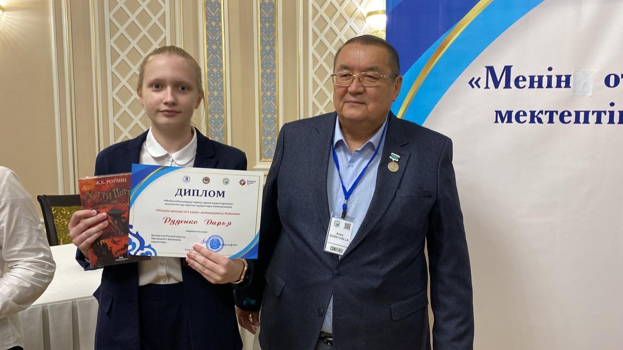 №165 мамандандырылған лицейдің 9А сынып оқушысы Руденко Дарья -"Менің отбасымның тарихы архив құжаттарында" байқауында "Өзіндік ерекшелігі үшін" номинациясымен диплом мен бағалы сыйлық-кітап алды. Жетекшісі тарих пәнінің мұғалімі Самитова Ж.У.