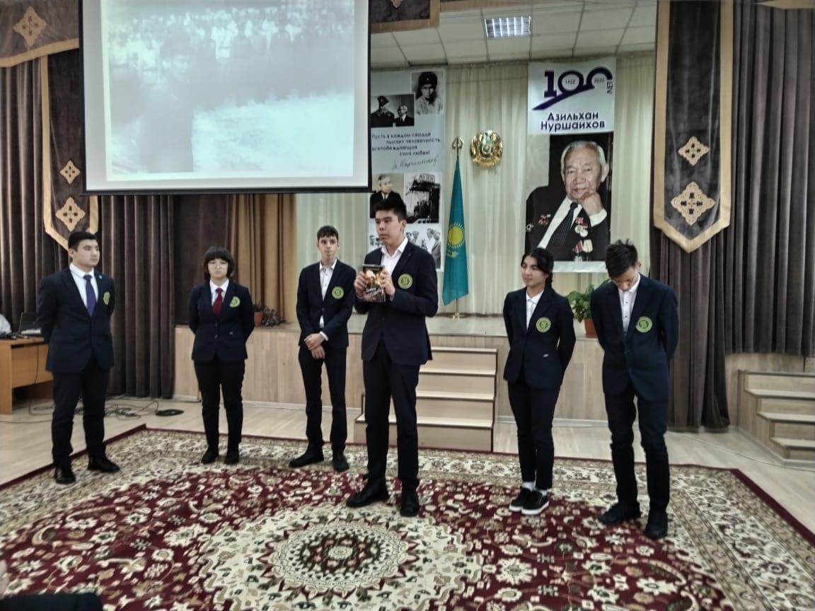 "Әр жүректе адамгершілік жанып тұрсын, махаббат барлық нәрсені жеңетін күші!». Мереке 9 "А" және 9 "Б" сынып оқушыларының сөз сөйлеуінен басталды. Балалар Ә. Нұршайховтың өмірі туралы әңгімелеп, әйгілі "Қуаныш пен махаббат жылдары" және "Ақиқат пен аңыз"романдарының үзінділерін сахналады. Әділдік сезімі, айналадағы адамдарға деген адалдық, ерік – жігер, болат мінезі-бұл А.Нұршайықовтың Кеңес Одағының Батыры, атақты қолбасшы Бауыржан Момышұлымен болған диалог-романында жеткізе алған басты нәрсе.