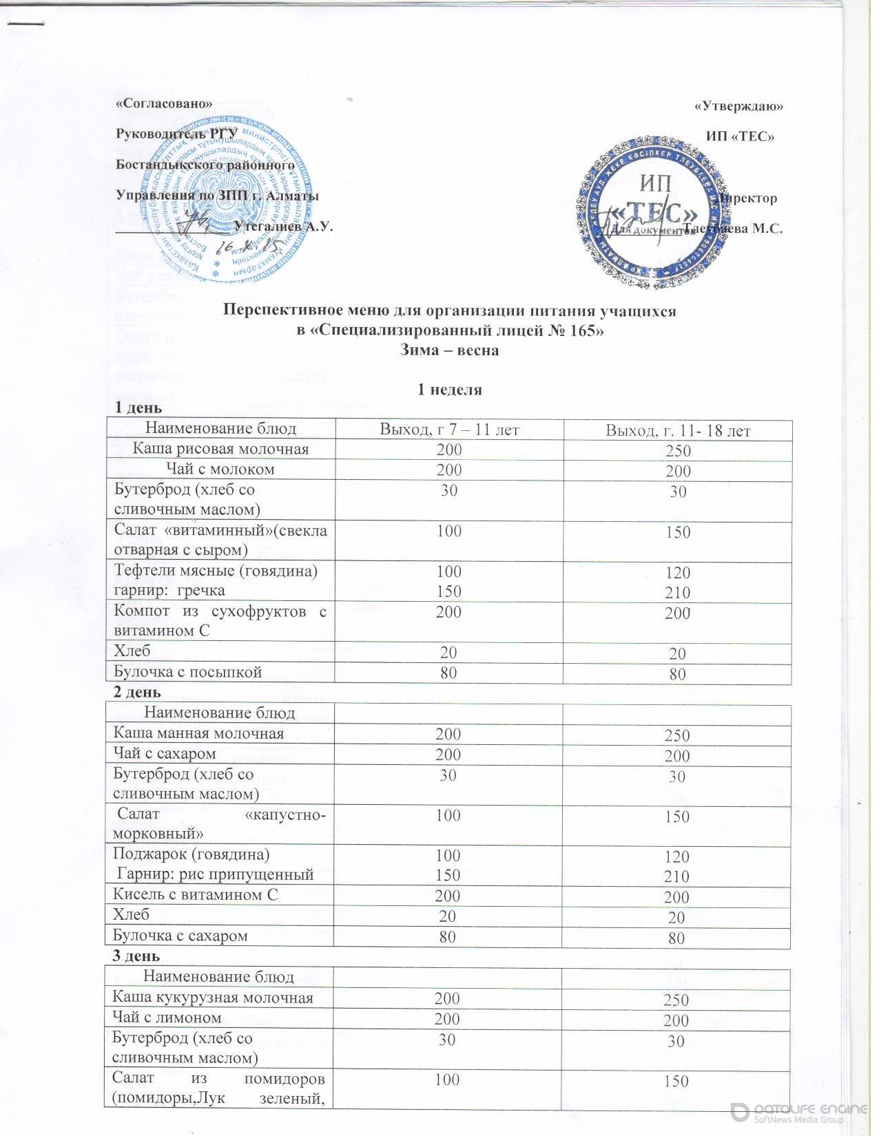 Коммунальное Государственное Учреждение «Специализированный лицей №165 » Управления образования г.Алматы по организации питания обучающихся в организации образования, получатели услуги 548 обучающихся, в том числе 20 обучающихся получающих питание бесплатно, за счет бюджетных средств.